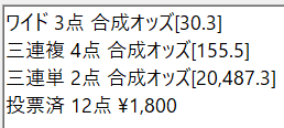 こんな感じで予想。楽天ポイントは期間限定ではない通常ポイントのみ使えます。3千ポイント以上使えますが、ここは千ポイントのみで挑んでワイド・三連複・三連単の10点で。即PATは昨日の勝ち分2千円ちょいありましたので三連単24点で行ってみました。